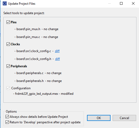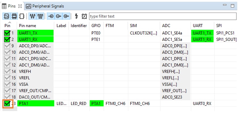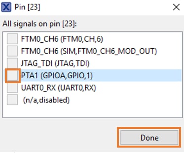 PTA1可路由为GPIO,以切换红色LED。在该示例中,我们将使用PTD5来驱动蓝色LEDPTA1。点击其旁边的复选框以取消选中