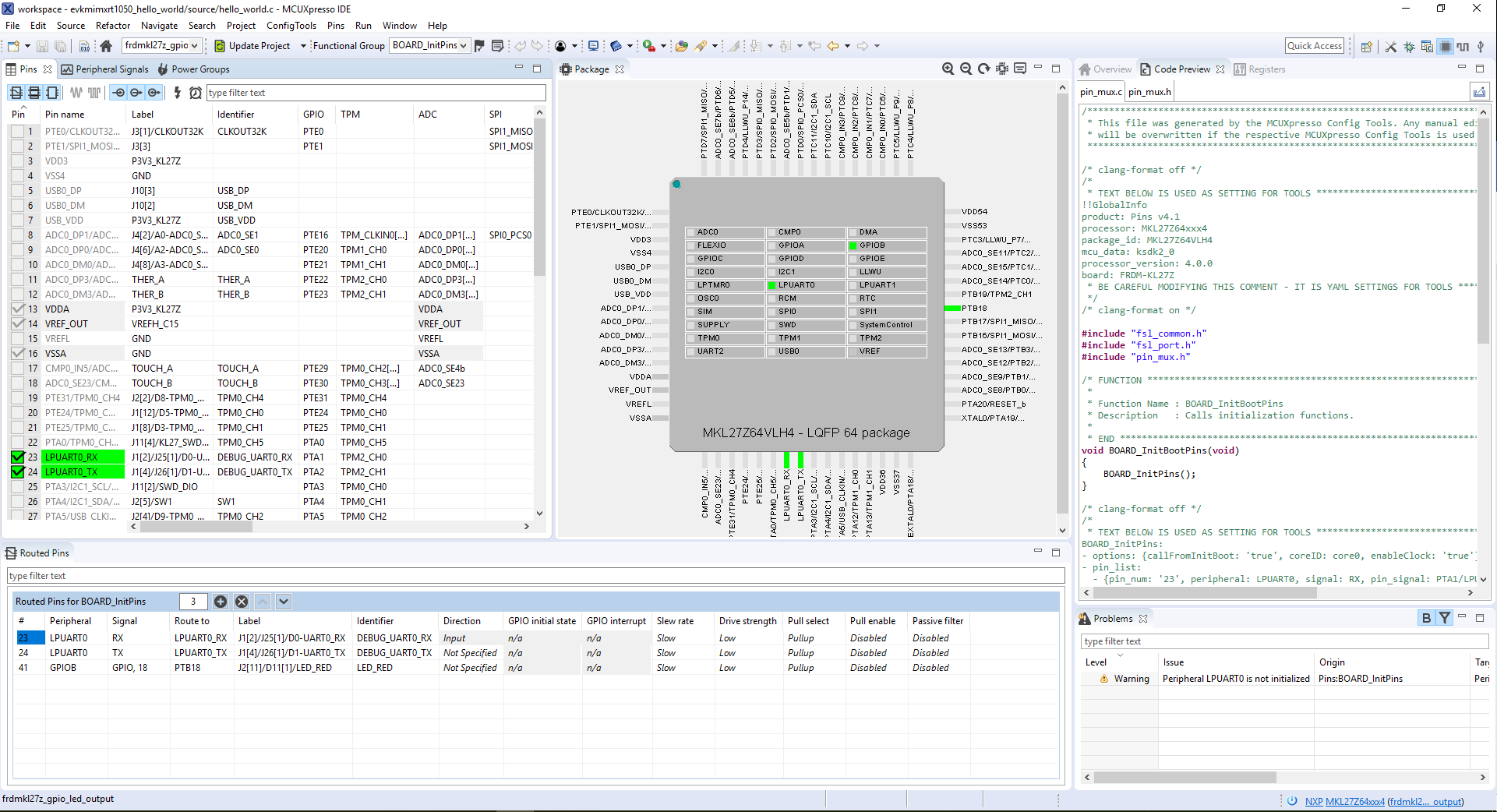 PTD5引脚。使用#defines,可在引脚工具创建的pin_mux.h中找到#define BOARD_LED_GPIO BOARD_INITPINS_MY_LED_GPIO