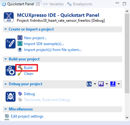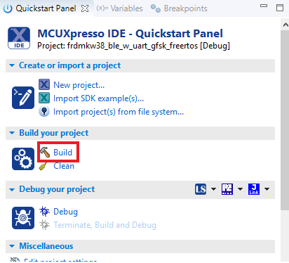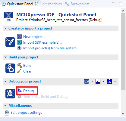 确保已插入FRDM-KW38板,然后点击快速启动面板,点击Debug。