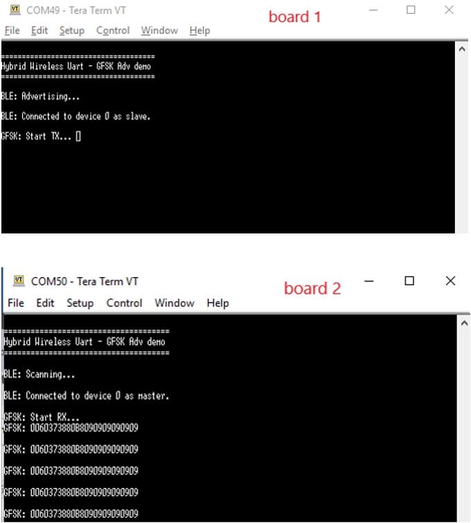 此时,您已使用ble_gfsk_adv演示编程了两个FRDM-KW38板。
