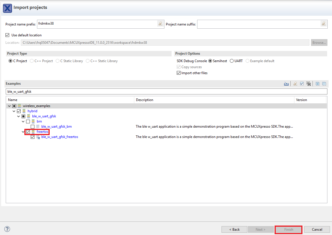 在搜索文本框中,键入“ble_w_uart_gfsk”以筛选示例项目。使用箭头按钮展开列表,并找到“ble_w_uart_gfsk”项目(wireless_examples -> hybrid -> ble_w_uart_gfsk),然后选择freertos版本的项目并点击“完成”。