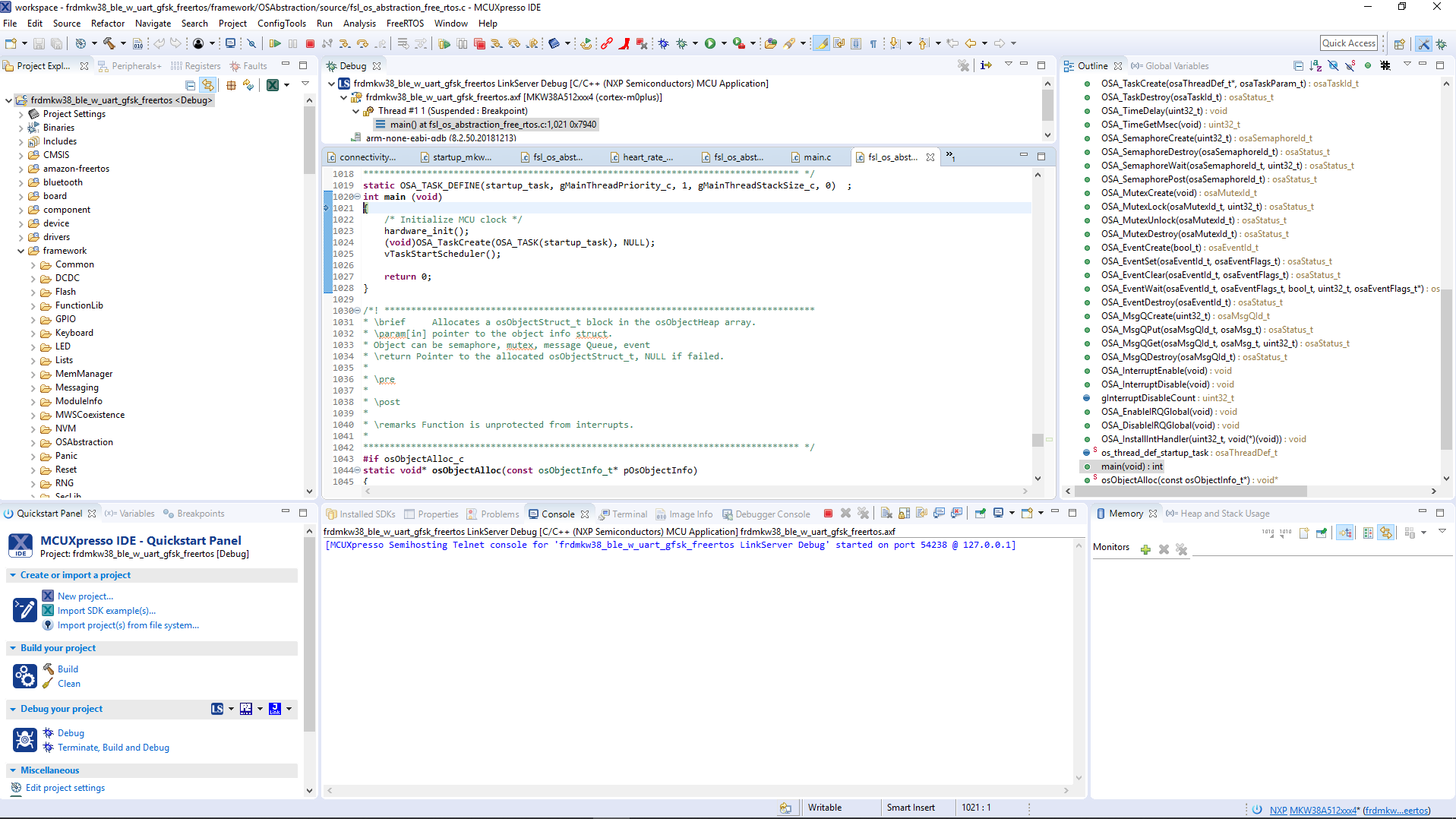 确保已插入FRDM-KW38板,点击”快速启动面板“,并点击Debug ‘frdmkw41z_wireless_examples_smac_connectivity_test_freertos’ [调试]