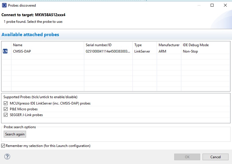MCUXpresso IDE将探测互联的板,并应查找JLink硬件调试器,此硬件调试器是FRDM-KW38上OpenSDA集成电路的一部分。点击OK (确定)继续。