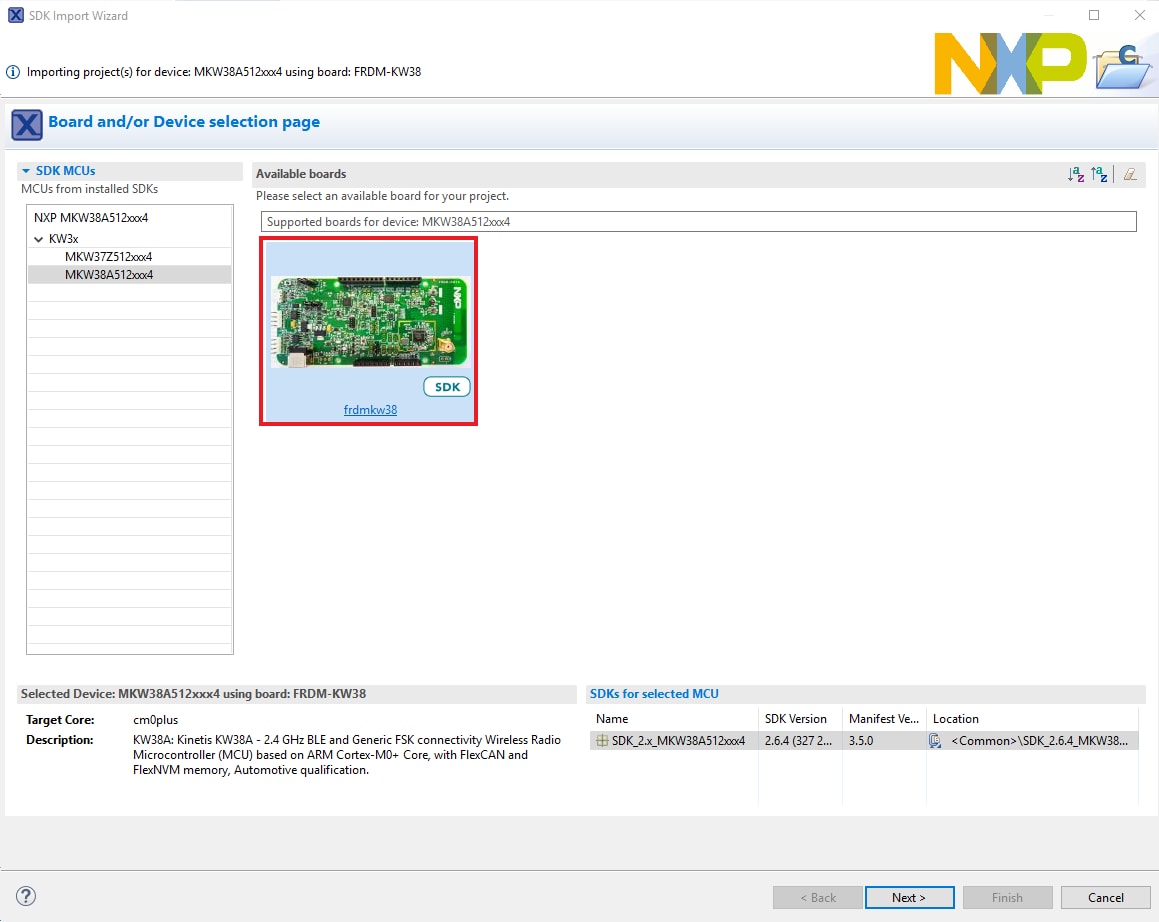 点击frdmkw38板,选择导入可在该板上运行的示例,然后点击Next。
