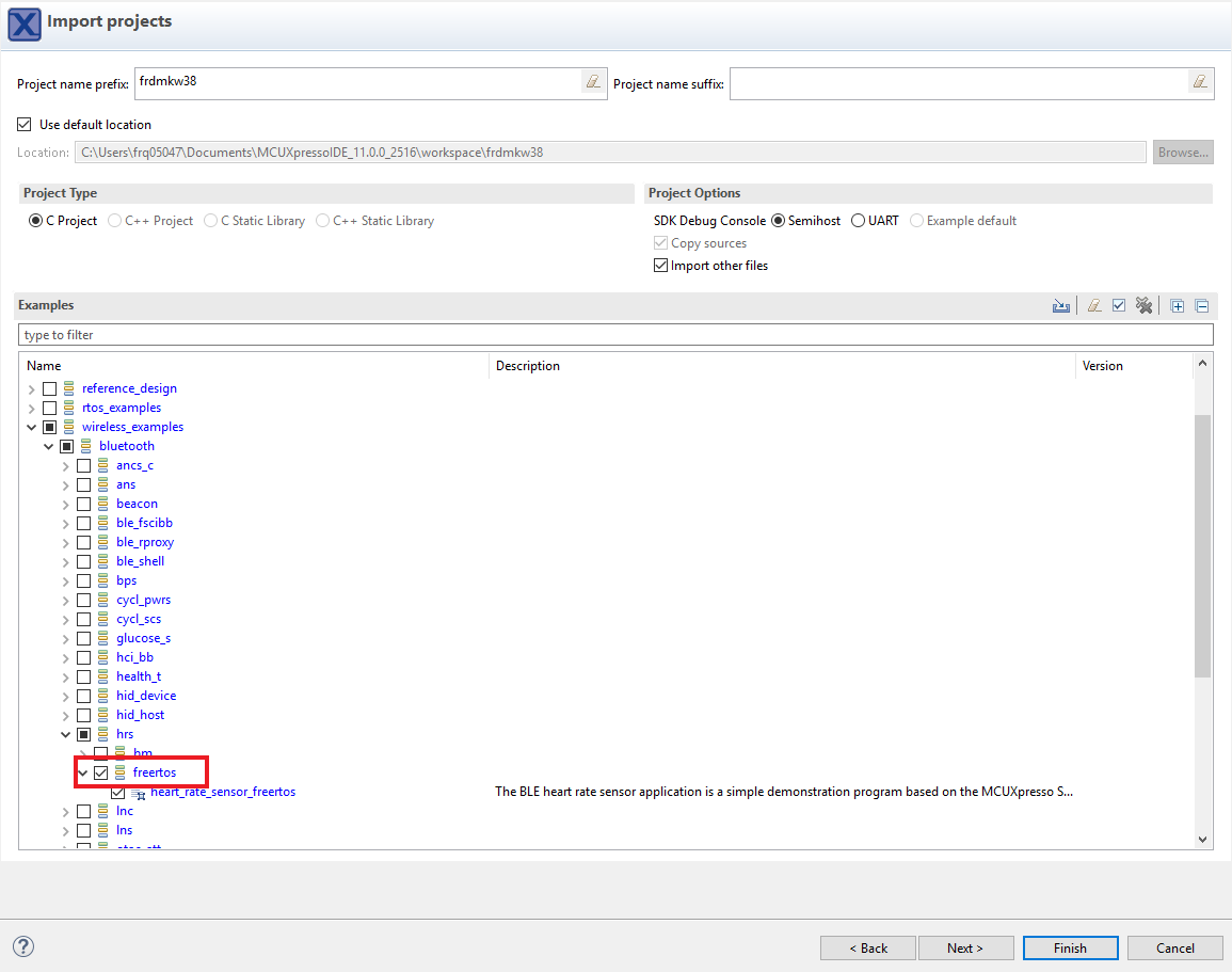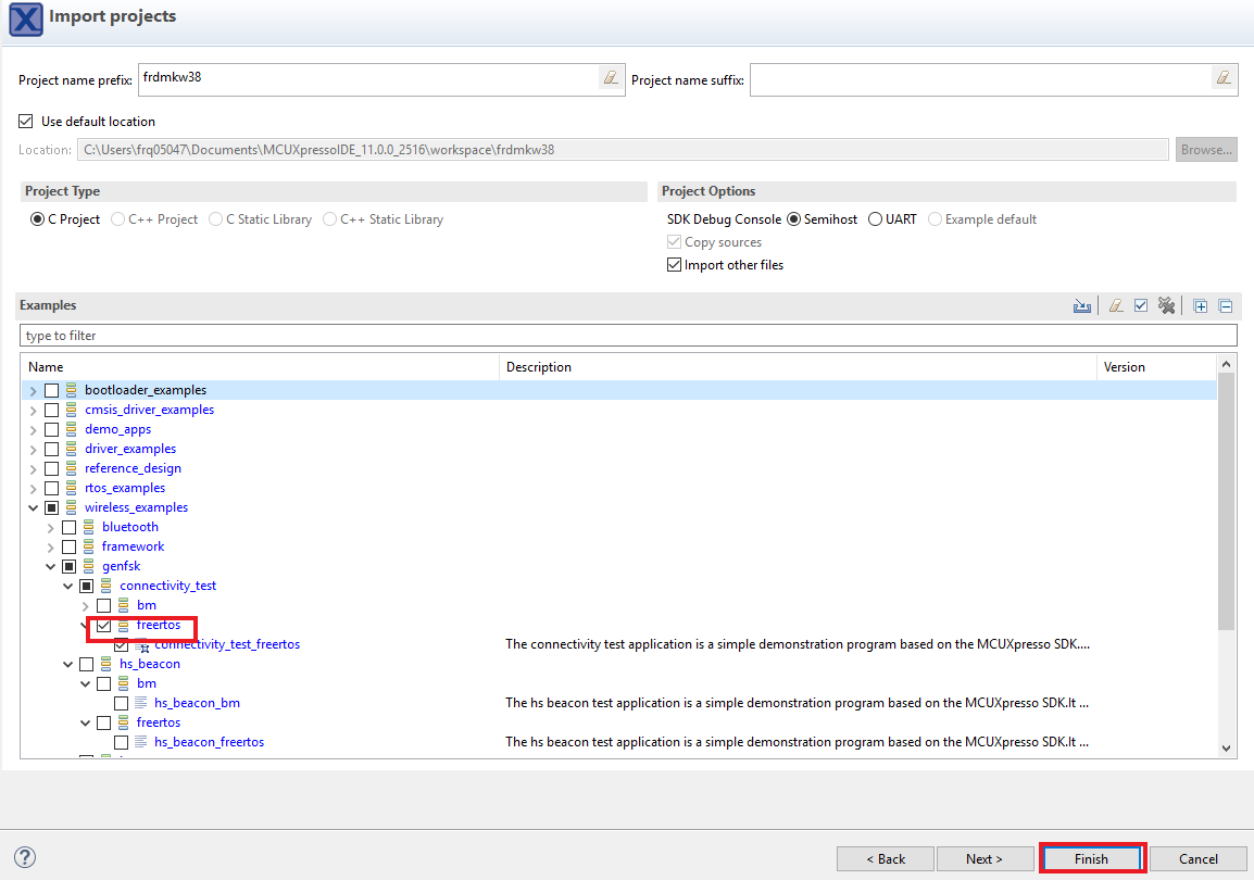使用箭头按钮来展开wireless_examples类别,然后在SMAC类别下,展开connectivity_test项目,并选择freertos版本的项目。要使用UART进行打印(而不是默认的半主机),请清除项目选项下的“启用半主机”复选框。然后点击Next。