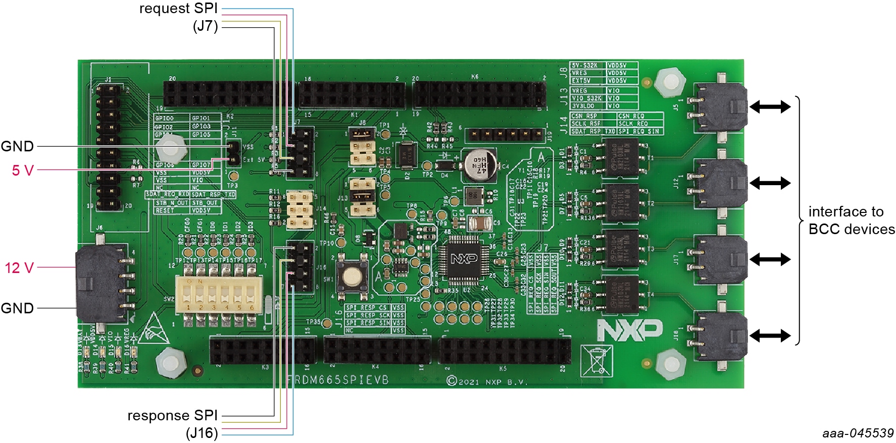 FRDM665SPIEVB可以连接外部微控制器板,实现MC33665A的SPI和GPIO接口。将J6的12V或外部5V连接到J11接口。使用跳线J8选择5V连接MC33665A。为外部微控制器板和FRDM665SPIEVB选择正确的VIO时应谨慎小心。跳线J13可用于为MC33665A选择正确的VIO 在为板上电之前,交叉检查为微控制器板和FRDM665SP EVB选择的VIP。必须仔细地连接从外部微控制器板到FRDM665SPIEVB的请求SPI和响应SPI的互连线。必须使用双绞线,短GND线与板连接(FRDM665SPIEVB和MCU)。