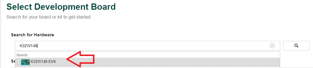 在“Search for Hardware”(搜索硬件)搜索框中,输入所选的板““K32W148-EVK”。点击此板选择它。