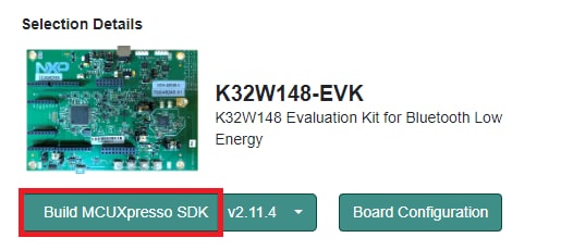 在右侧,您将看到为K32W148-EVK构建SDK的选项。单击此按钮以添加所需的中间件。
