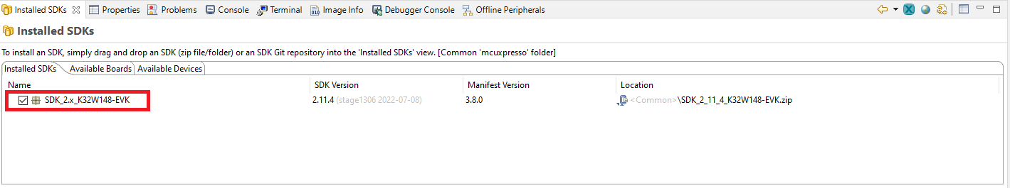 下载完SDK包后,拖放到MCUXpresso IDE中的“已安装SDK”窗口。