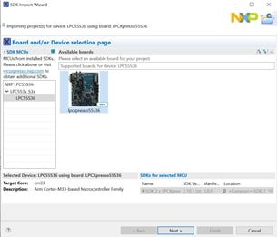 MCUXpresso SDK附带一系列示例应用代码。如需查看具体内容,请浏览SDK安装中的SDK板文件夹,并选择LPCXpresso55s36。