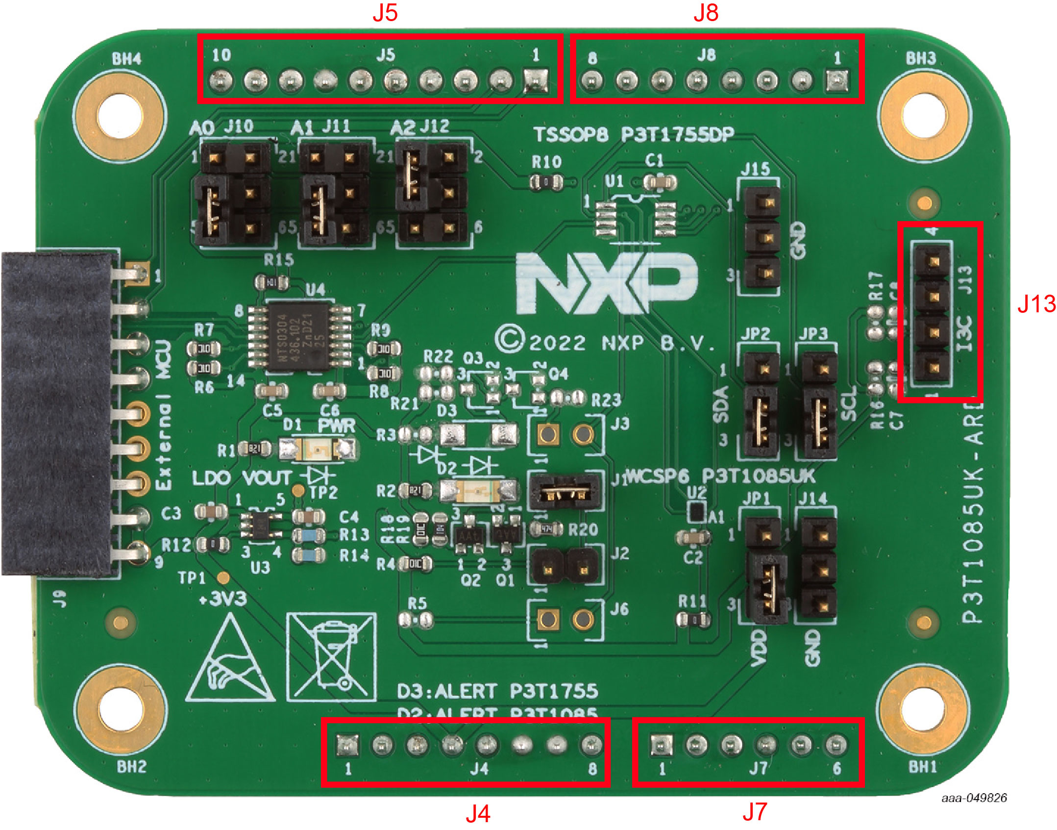 P3T1085UK-ARD评估板使用四个连接器(P3T1085UK-ARD板上的J4/J5/J7/J8 和MIMXRT685-EVK板上的 J27/J28/J29/J30)连接到I2C总线和电源,使用一个连接器(P3T1085UK-ARD板上的J18和MIMXRT685-EVK板上的J)连接到I3C总线。