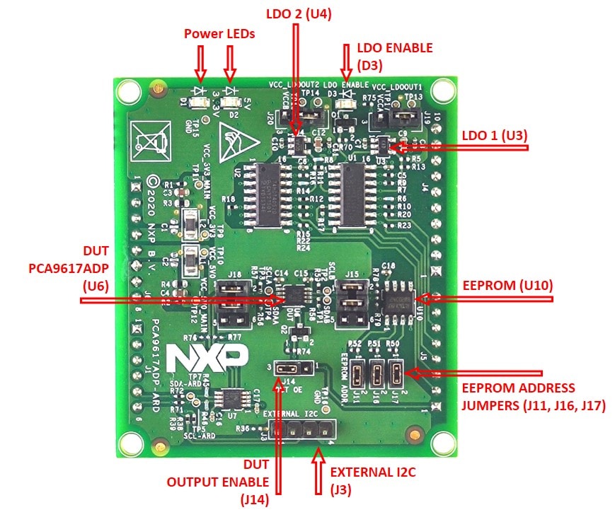 PCA9617A是一种电平转换FM+I2C总线中继器,此评估板基于PCA9617A构建。此评估板用作子卡,可通过Arduino端口连接到各种兼容Arduino的(包括原Arduino Uno R3)EVK/主板,以测试和测量PCA9617A被测设备(DUT)的特性。