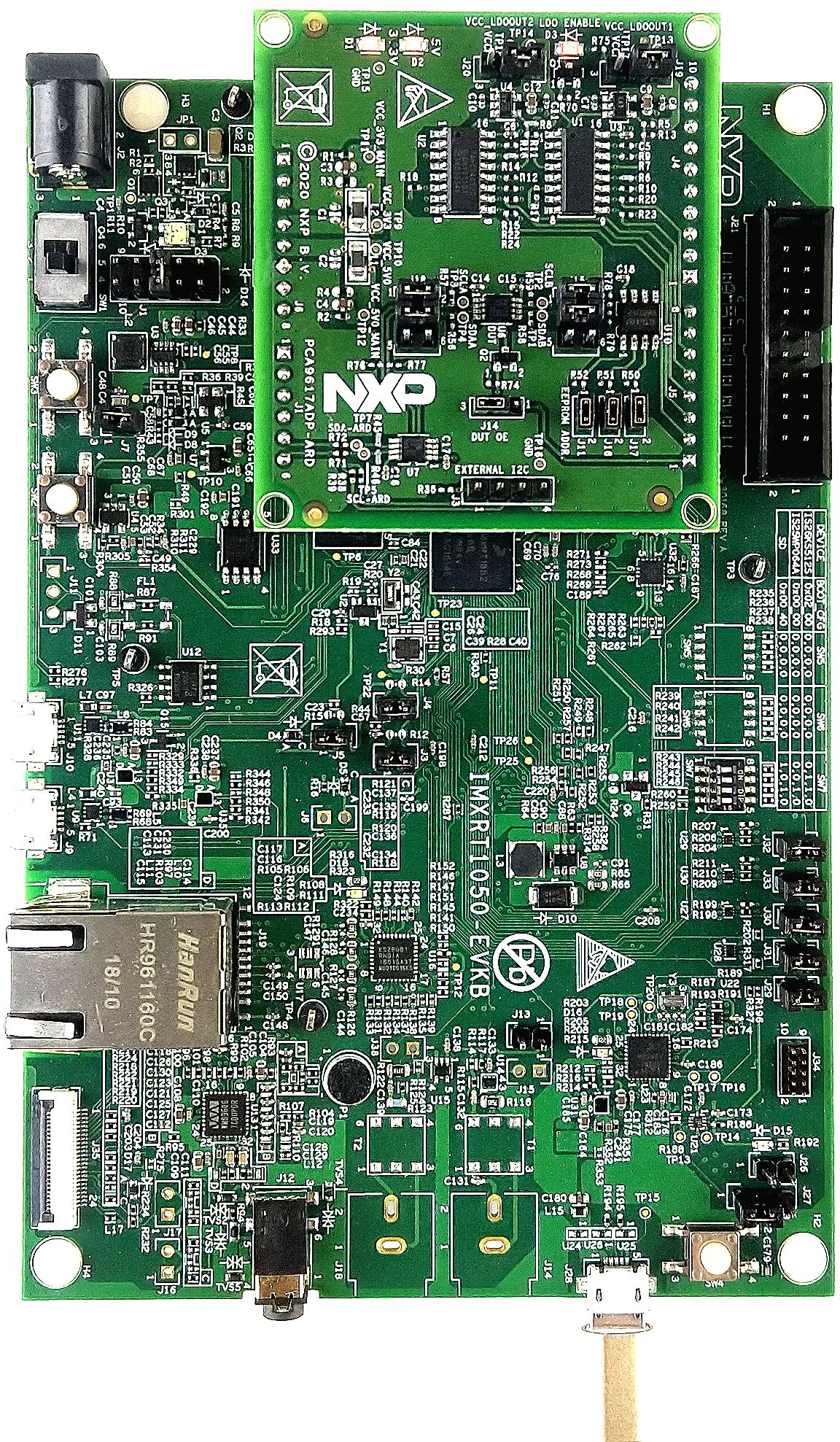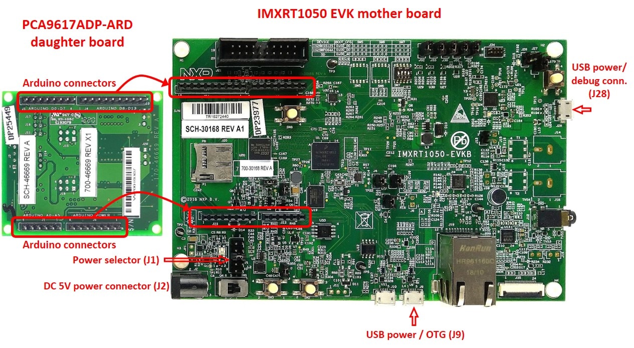 图1 PCA9617ADP-ARD子板和IMXRT1050 EVK板(启动前)