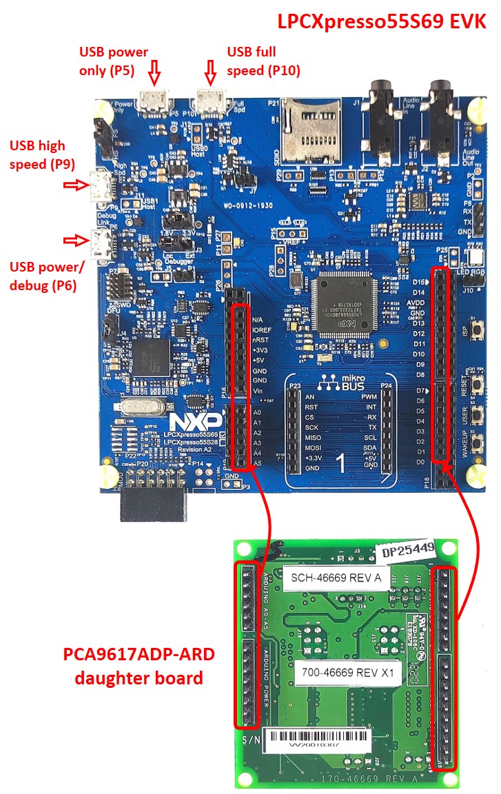 图3 PCA9617ADP-ARD子板和LPCXpresso55S69主板(启动前)