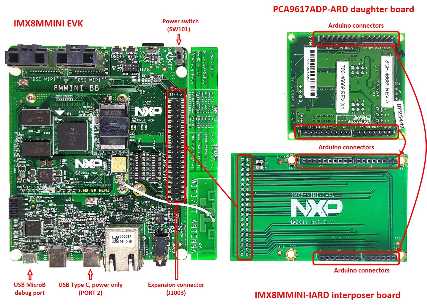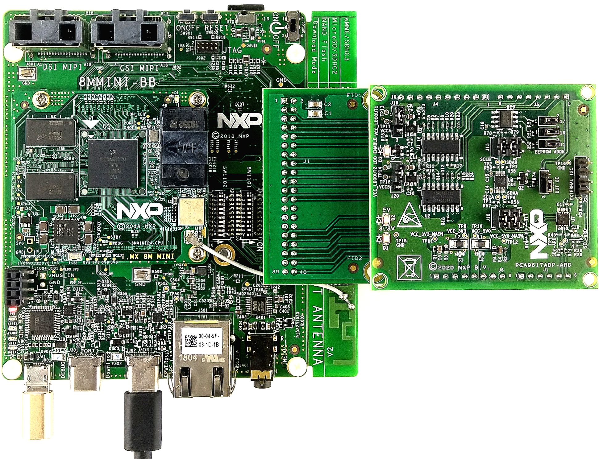 图5 PCA9617ADP-ARD子板、IMX8MMINI-IARD内插板和i.MX 8M Mini LPDDR4 EVK组件(启动前)