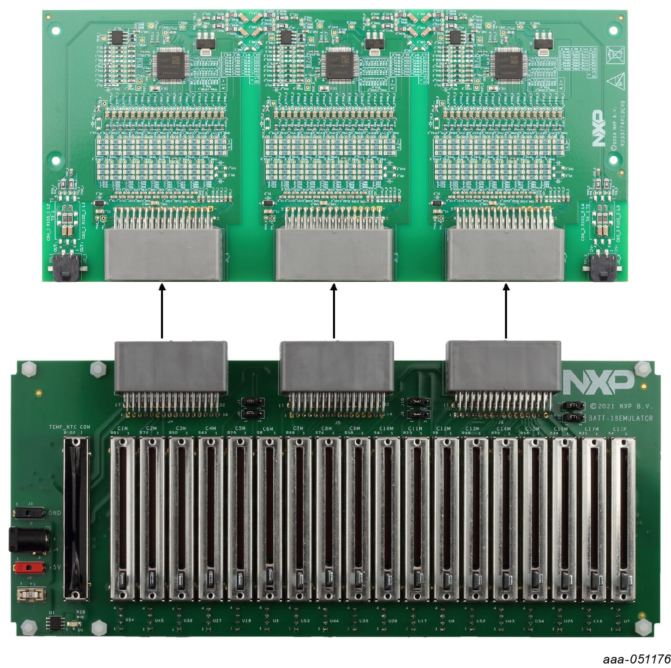 一个MC33774ATP至少可以监测4节电芯,最多可以监测18节电芯。恩智浦提供18芯电池仿真器板BATT-18EMULATOR。该板提供了一种直观的方式来改变仿真电池组的18节电池中的任何一节的电压。RD33774PC3EVB板可以使用随附的电源线通过J1_1J1_2J1_3连接器连接到18芯电池仿真器板。见图2。