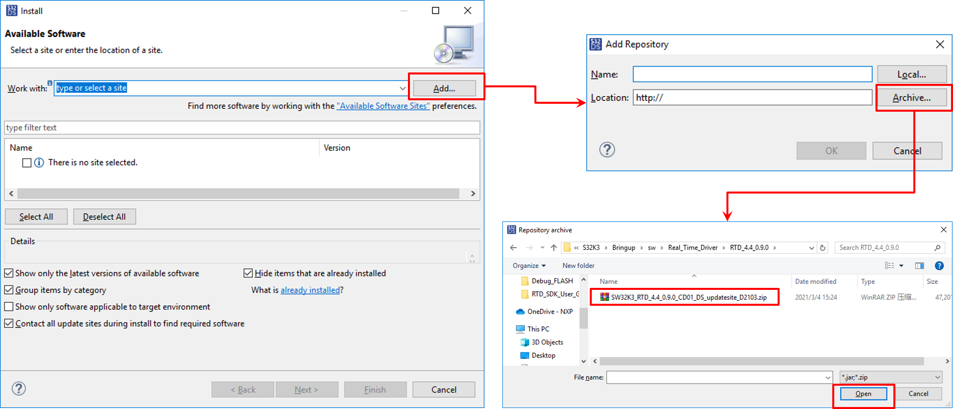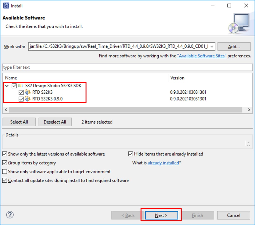 对于最新的S32K3xx RTD 0.9.0,应下载并安装 SW32K3_RTD_4.4_0.9.0_DS_updatesite_D2103.zip