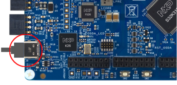将USB-C线缆连接到J9连接器,通过板载S32K3调试器进行调试。