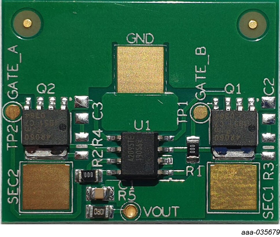 The TEA2095DB1574 demo board consists of the TEA2095TE in an HSO8 package with exposed die pad and two MOSFETs in an LFPAK package with a typical RDSon of 4.0 mΩ. The TEA2095DB1574 demo board is a single layer board, with one plated-through via for improved solderability and robustness.