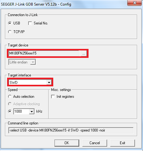 Modify the settings as shown below. The target device selection chosen for this example is the "MK80FN256xxx15"
