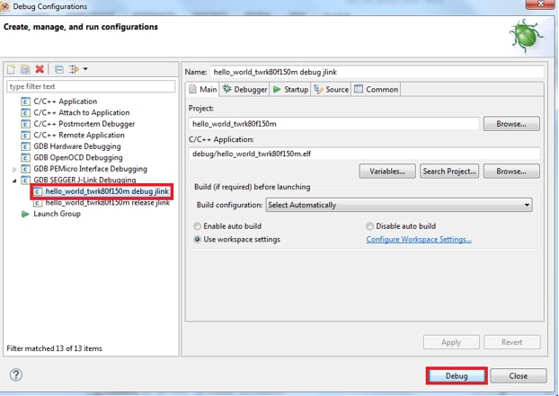 In the Debug Configurations dialog box, select debug configuration that corresponds to the hardware platform you’re using. For Windows or Linux users, Select is the ‘hello_world_twrk80f150m debug jlink’ option under GDB SEGGER J-Link Debugging