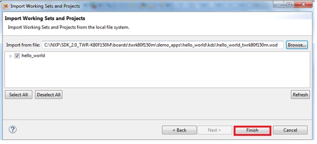 After pointing to the correct directory, your "Import Working Sets and Projects" window should look like the figure below. Click the "Finish" button