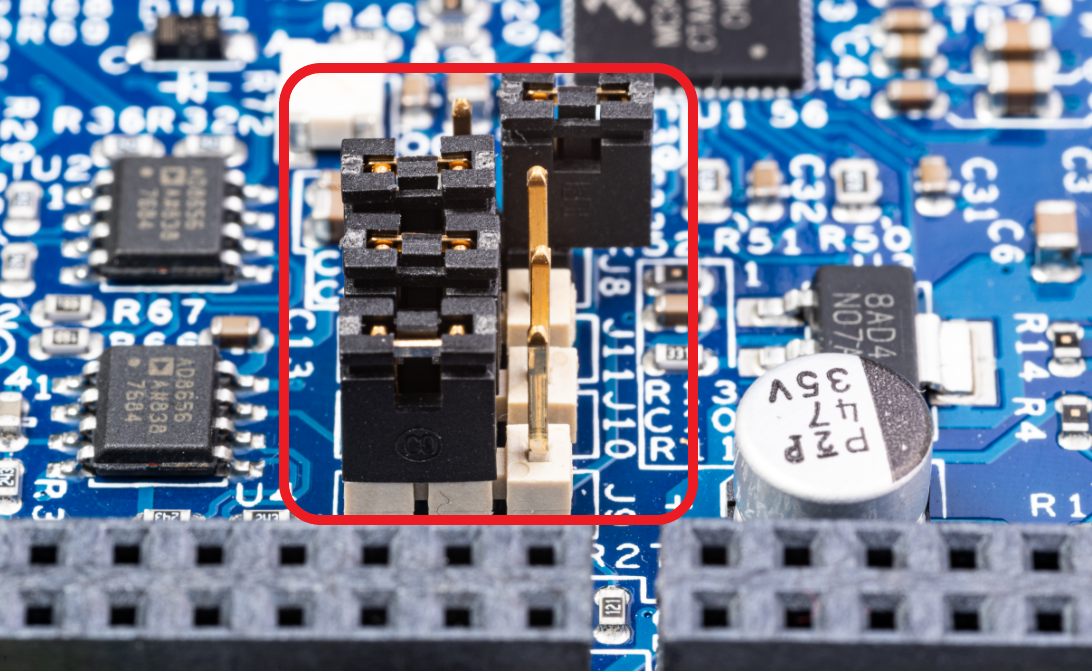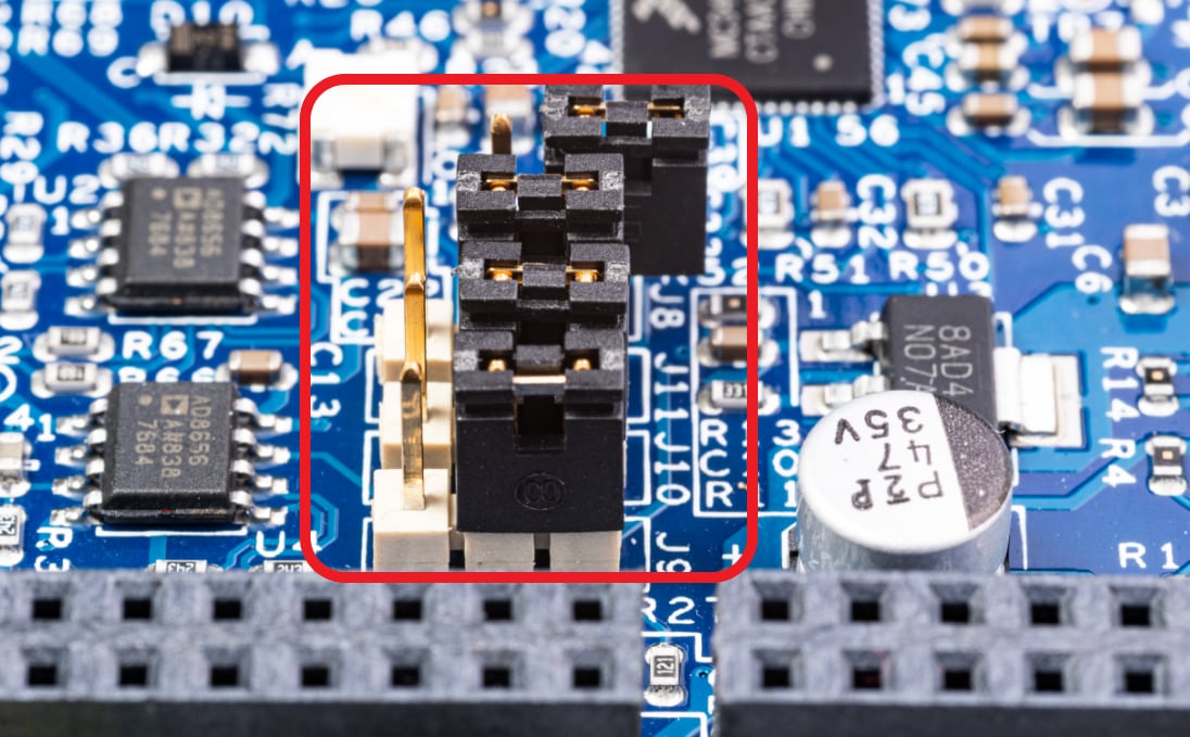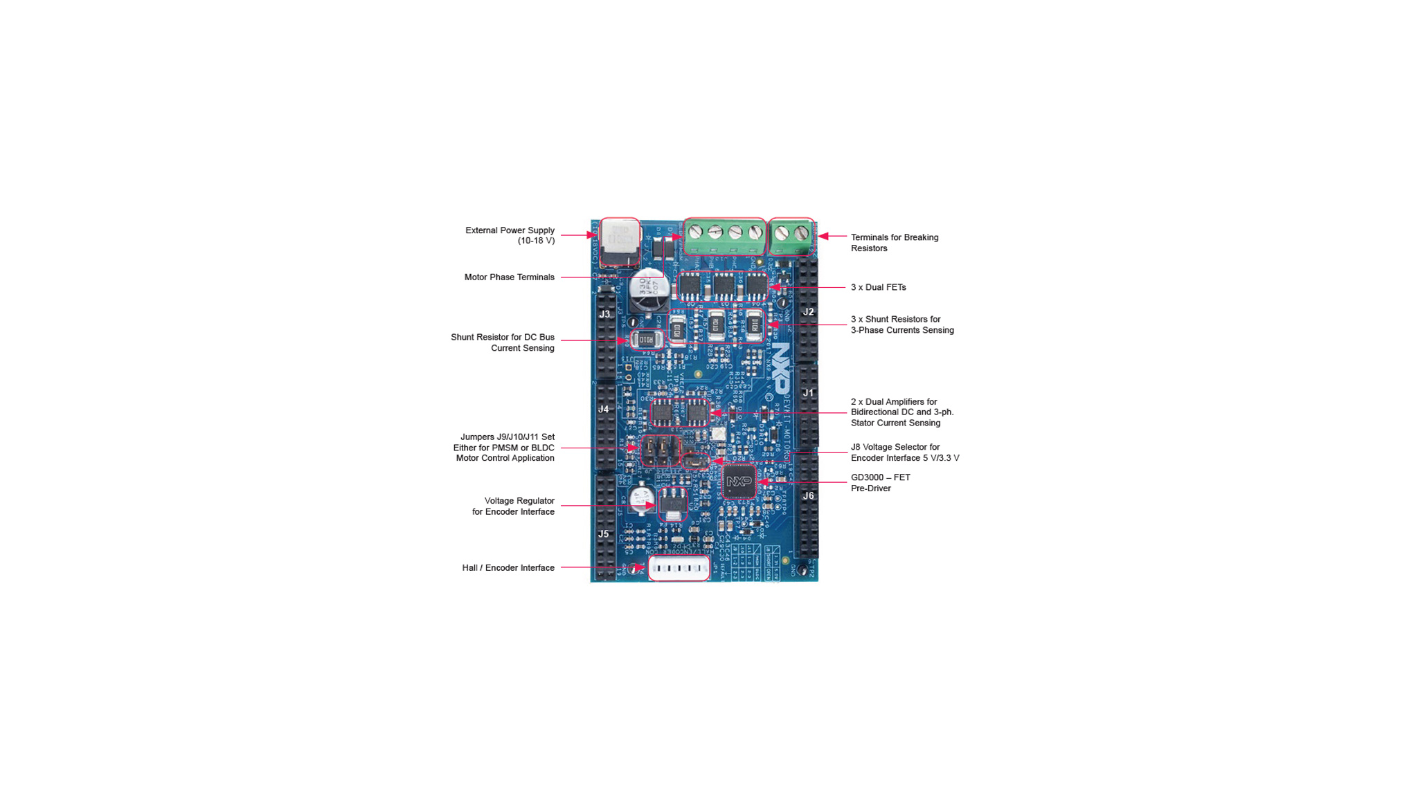 3. 将DEVKIT-MOTORGD跳线J9、J10和J11放置在1-2位置(适用于PMSM应用)或2-3位置(适用于BLDC应用)。对于5 V霍尔传感器,跳线J8保持断开状态。
