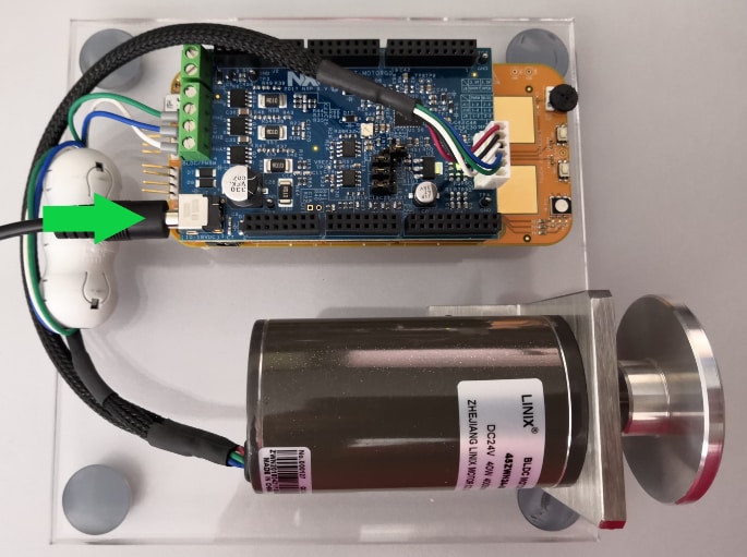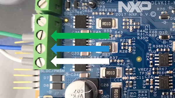 连接12V电源,为S32K144EVB和DEVKIT-MOTORGD板以及3相PM电机供电。S32K144EVB配置为从DEVKIT-MOTORGD板供电。直流电源电压应保持在8到18 V的范围内。