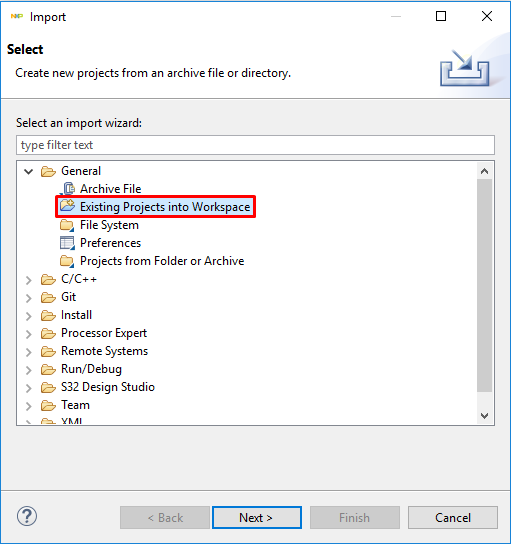 要在S32 Design Studio IDE for Arm®中导入已安装的应用软件项目: