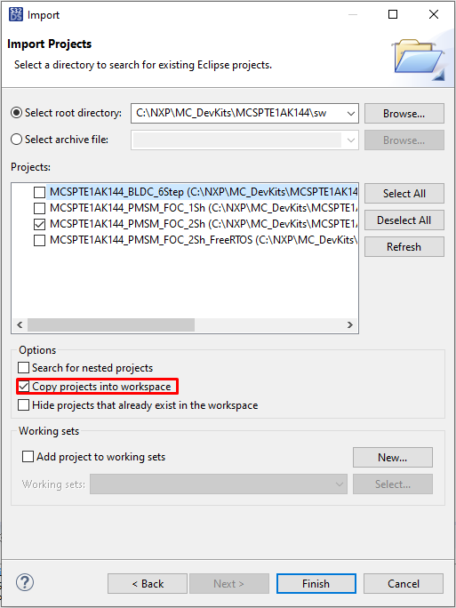 NXP\MC_DevKits\MCSPTE1AK144\sw并选择适当的项目,然后点击OK (确定)。接着,点击Finish (完成)。