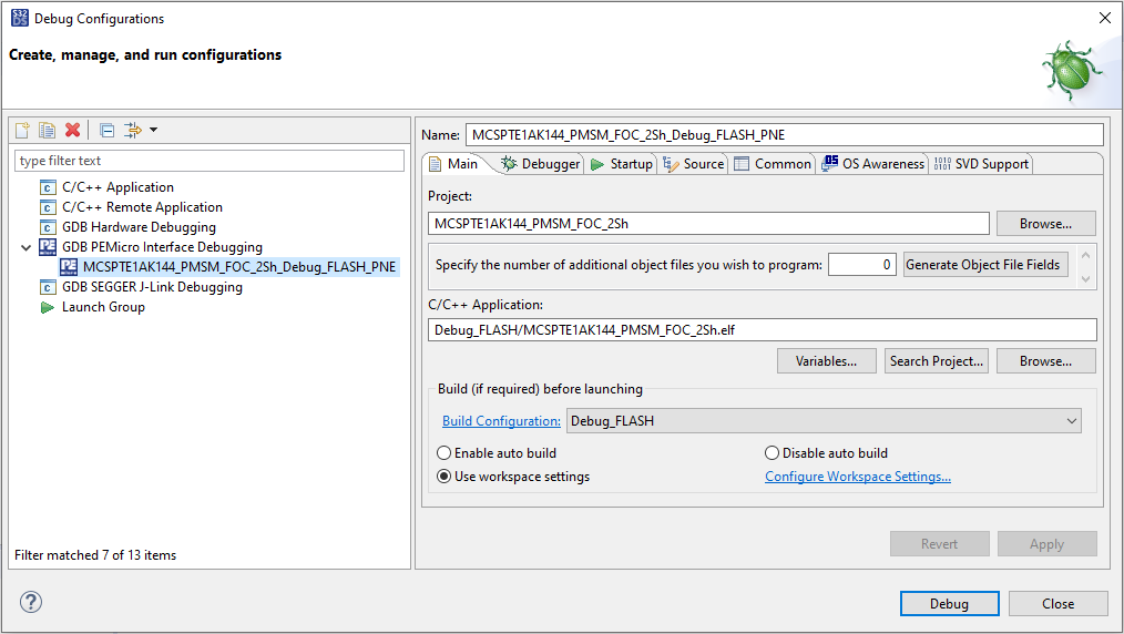 在S32 Design Studio菜单中,点击运行 >调试配置,并选择预定义的调试配置,然后点击Debug (调试),开始将构建的代码加载到MCU中。