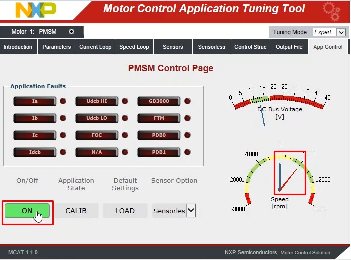 1. 要显示应用控制页,在电机控制应用调优工具菜单上点击App Control (应用控制)选项卡。