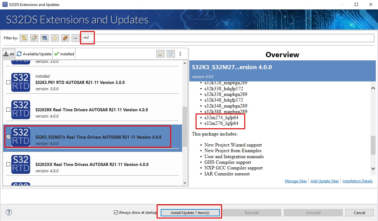 安装列表中的RTD 4.0.0。注意,RTD 4.0.0可能会在列表中出现两次以上。确保选择的版本仅支持/也支持S32M27x (请参阅右侧“概述”窗口的内容)。