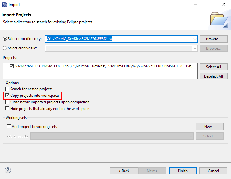 NXP\MC_DevKits\S32M276SFFR\sw并选择适当的项目,然后点击OK (确定)。然后点击“完成” 注:选中Copy projects into workspace(将项目复制到工作区)选项框。