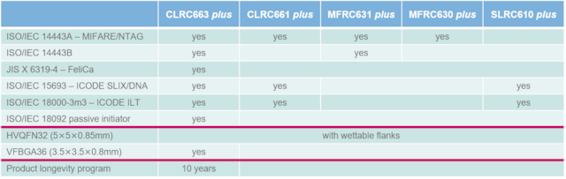 如果您需要NFC高性能或最低功耗,可使用这个非常高效、高度灵活的前端来进一步推动您的设计。它还能支持扩展的温度范围、与CLRC663+系列(见下表)引脚兼容,提供节省时间的软件工具。CLRC663+系列产品支持MIFARE®、ISO/IEC 14443、ISO/IEC 15693和ISO/IEC 18000-3m3,是与恩智浦NFC标签匹配的天然配套部件。