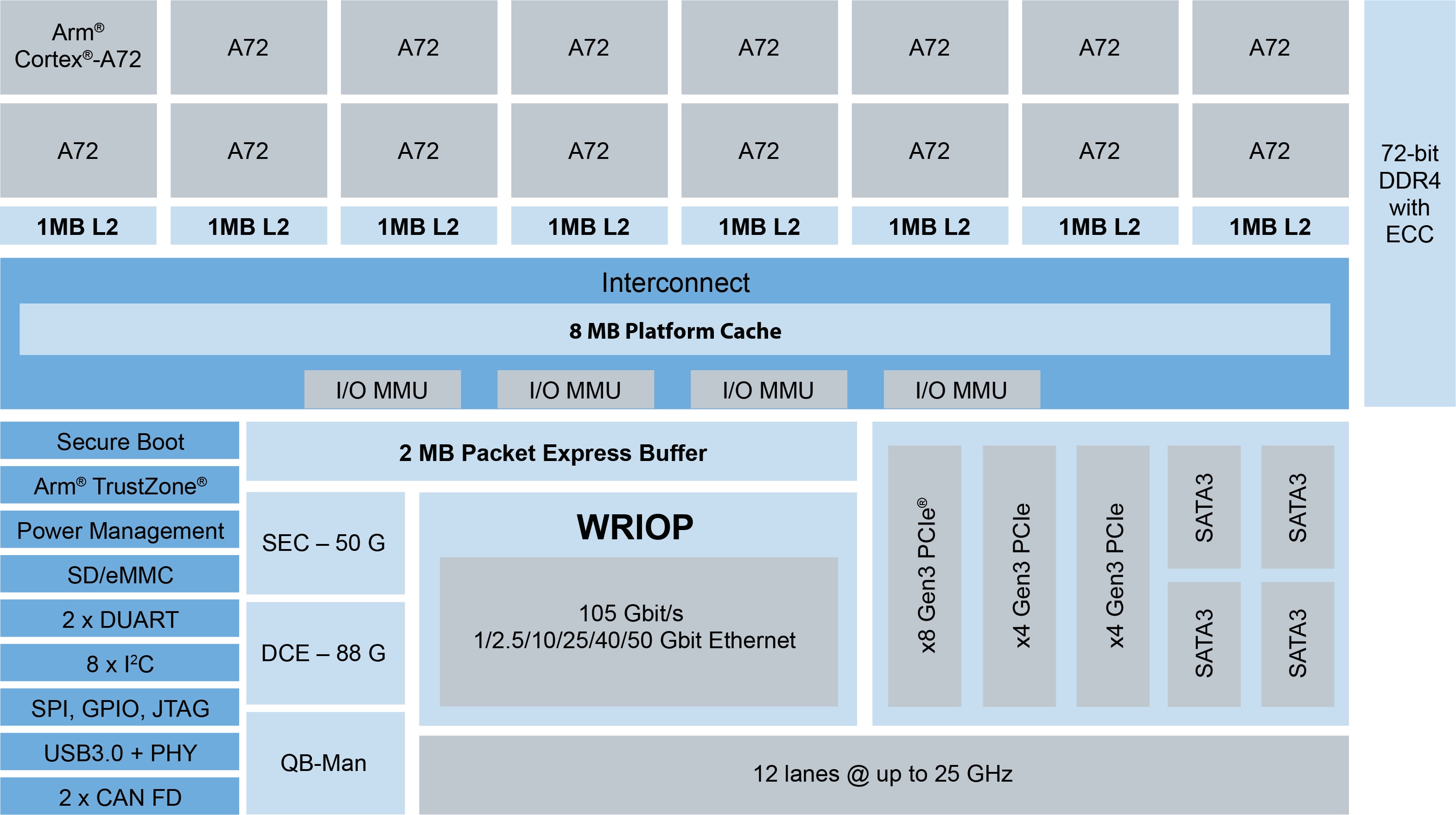 This advanced processor is suitable for small boards such as network interface cards, COM Express Type 7 modules, OCP3 mezzanine cards and custom daughter cards. It retains LX2160A’s 16 Cortex-A72 cores, 50 Gbit/s security engine and 88 Gbit/s data compression engine. It has 12 SerDes lanes at up to 25 Gbit/s, which can support four 25 Gbit Ethernet and x8 PCIe Gen3 simultaneously, among many other combinations.
