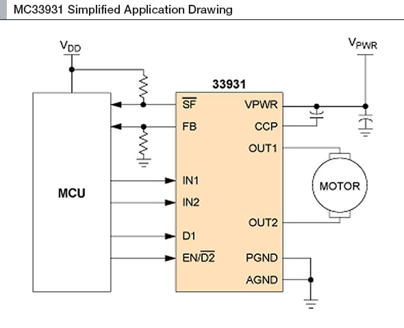恩智浦MC33931是一款单片H桥电源IC,采用耐用的热增强型封装,主要针对汽车电子油门控制而设计,但也能用于电流和电压规格范围内的任何低压DC伺服电机控制应用。