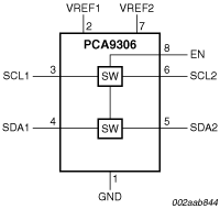 PCA9306不是类似PCA9509或PCA9517A的总线缓冲器,不能在两侧连接时提供两个电平变换和物理隔离总线任一侧的电容。PCA9306只能在器件禁用时隔离两侧而在激活时提供电压电平变换。