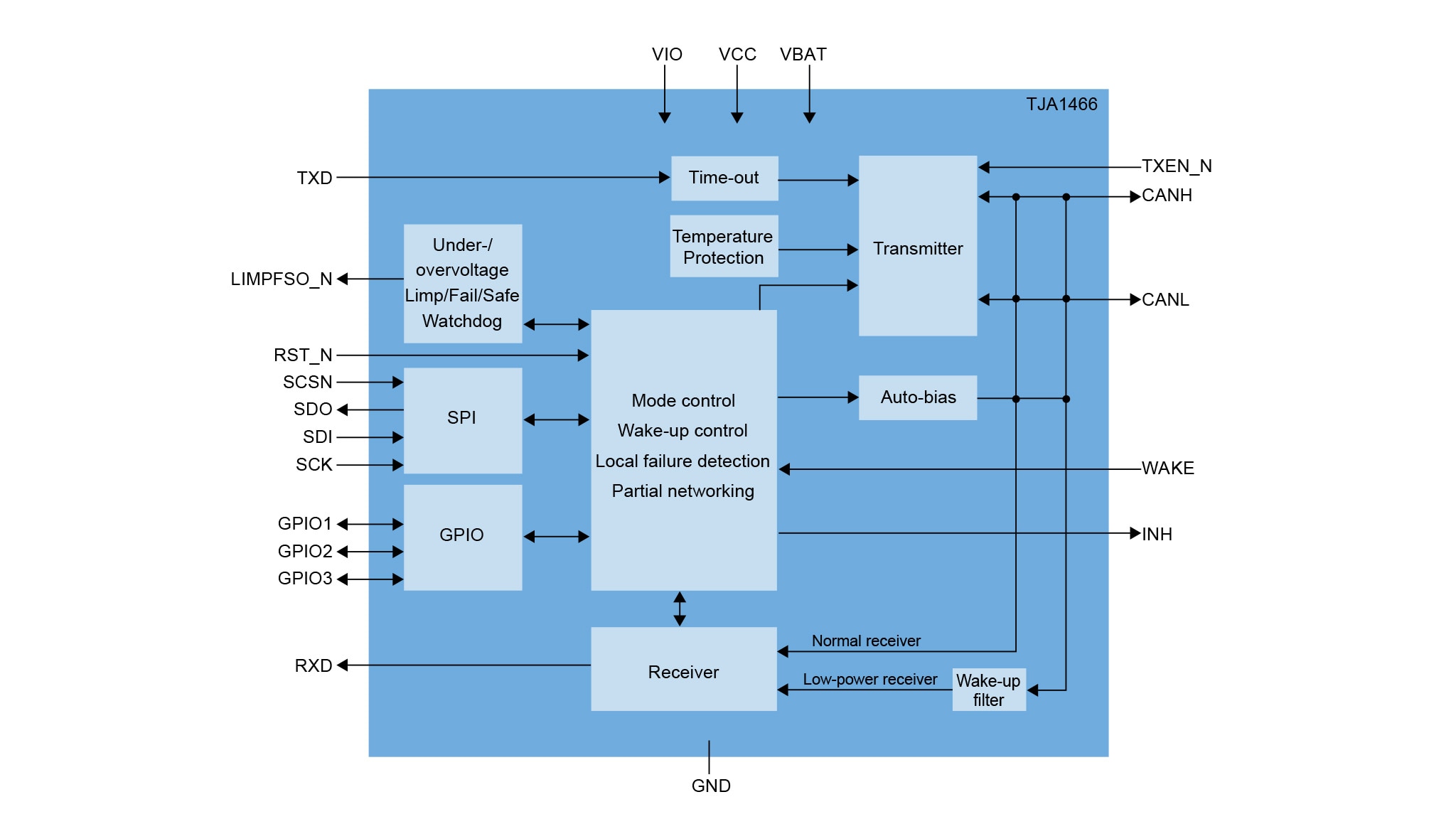TJA1466在TJA1465的基础上扩展了功能集,包括两个可配置的GPIO引脚、一个带有专用复位和故障安全/跛行回家引脚的问答看门狗,以及精确的VIO欠压和过压监测。