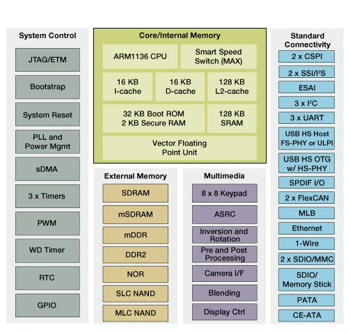 i.MX355处理器充分利用了532 MHz ARM11™内核的优势,具有图像处理单元的优点。i.MX355集成了多声道(5.1)音频增强串行音频接口(或ESAI)、压缩数字音频连接用SPDIFI/O和面向具有不同采样频率的混合数字内容的高级采样率转换器(ASRC)。为了提供灵活的连接选项,i.MX355集成了两个CAN模块、媒体本地总线(或MLB)、以太网,并能够通过SDIO或USB端口连接外部无线模块。为降低系统成本,在Host端口上添加了全速PHY,在OTG端口上添加了高速PHY。支持3.3V SDRAM、DDR2和多级单元NAND等成本更低的存储器。还包括存储器件连接P-ATA和CE-ATA。