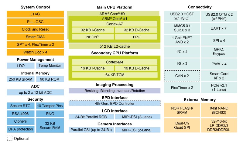 i.MX7Dual 系列处理器代表了我们在低功耗高性能处理方面的最新成果,同时该系列处理器具有高度的功能集成度。这些处理器针对的是不断增长的互连设备市场。i.MX 7Dual 系列处理器配备我们先进的 Arm® Cortex®-A7 内核,运行速度高达 1.2 GHz,还配有 Arm Cortex-M4 内核。i.MX 7Dual 系列支持多种存储器类型,包括 16/32 位 DDR3L/LPDDR2/LPDDR3-1066、Quad SPI 存储器、NAND、eMMC 和 NOR。通过 AVB、PCIe 和 USB 支持包括千兆以太网在内的 7 种高速连接。提供并行和串行显示器和摄像头接口,支持直接连接电泳显示屏 (EPD)。