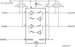 • SDA和SCL线路的双向缓冲器会增加扇出并防止在多点背板系统中进行带电板卡插入和拔出时发生SDA和SCL恶化。