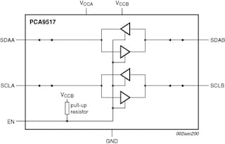 除非VCCA高于0.8 V且VCC高于2.5 V,否则不会启用PCA9517驱动器。也可使用EN引脚在系统控制下打开和关闭驱动器。应该注意,当总线闲置时仅改变使能引脚的状态。