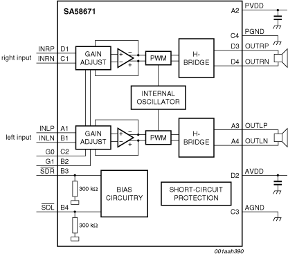 The SA58671 is a stereo, filter-free class-D audio amplifier which is available in a 16 bump WLCSP (Wafer Level Chip-Size Package).