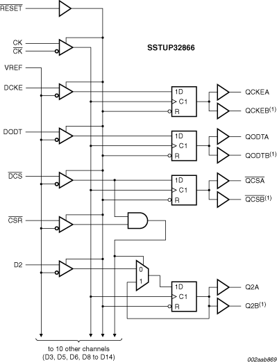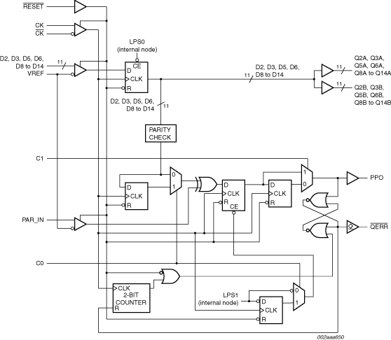 The SSTUP32866 is a 1.8 V configurable register specifically designed for use on DDR2 memory modules requiring a parity checking function. It is defined in accordance with the JEDEC standard for the SSTUA32866 and SSTUB32866 registered buffers. The register is configurable (using configuration pins C0 and C1) to two topologies: 25-bit 1 : 1 or 14-bit 1 : 2, and in the latter configuration can be designated as Register A or Register B on the DIMM. It offers added features over the JEDEC standard register in that it can be configured for high or normal output drive strength, as well as for operation to 667 MT/s or 800 MT/s, simply by tying two input pins HIGH or LOW as needed.