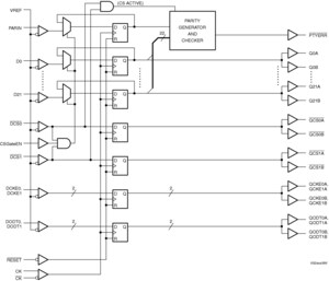 SSTU32865还集成了奇偶校验功能,其接受来自存储控制器的奇偶校验位,将其与D输入上接收到的数据进行比较,并指明其开漏PTYERR针脚(低电平有效)上是否发生奇偶校验错误。