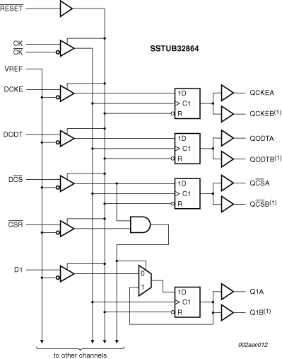该器件可监视DCS输入和CSR输入,并且在DCS输入和 CSR输入都为高电平时会通过改变状态来选通Qn输出。只要DCS或CSR输入为低电平,Qn输出就会正常工作。RESET输入的优先级高于DCS和CSR控制并且会将输出强制为低电平。如果无需DCS控制功能,则CSR输入可以硬接地,其中DCS的设置时间要求将与其它Dn数据输入的相同。