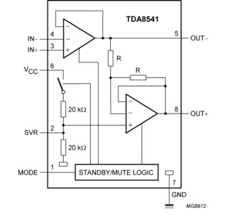 TDA8541(T)是单声道音频功率放大器,在电源电压为5 V时向8Ω负载提供1 W的输出功率。该电路包含一个BTL放大器以及互补PNP-NPN输出级和待机/静音逻辑。TDA8541T采用8针SO封装,TDA8541采用8针DIP封装。