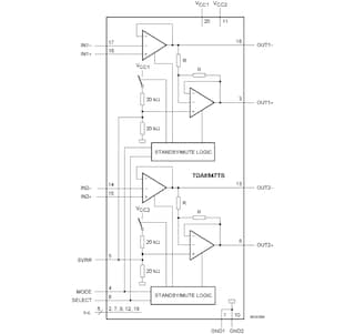 TDA8547TS是双声道音频功率放大器,在电源电压为5 V时向16 Ω负载提供2 x 0.7 W的输出功率。在3.3 V的低电源电压下,8Ω负载时可以获得0.6 W的输出功率。该电路包含两个BTL放大器以及互补PNP-NPN输出级和待机/静音逻辑。器件的所有通道的操作状态(待机、静音或打开)由MODE引脚外部控制。通过SELECT引脚,其中一个输出通道可以在待机状态下进行切换。该功能可用于扬声器选择,同时降低了静态电流消耗。只使用一个通道时,最大输出功率为1.2 W。