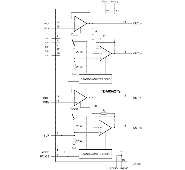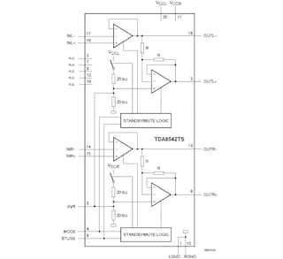 TDA8542TS是一款两声道音频功率放大器,输出功率为2 x 0.7 W,采用5 V电源时具有16Ω负载。在3.3 V的低电源电压下,8Ω负载时可以获得0.6 W的输出功率。该电路包含两个桥接式负载(BTL)放大器以及互补PNP-NPN输出级和待机/静音逻辑。TDA8542TS采用SSOP20封装。